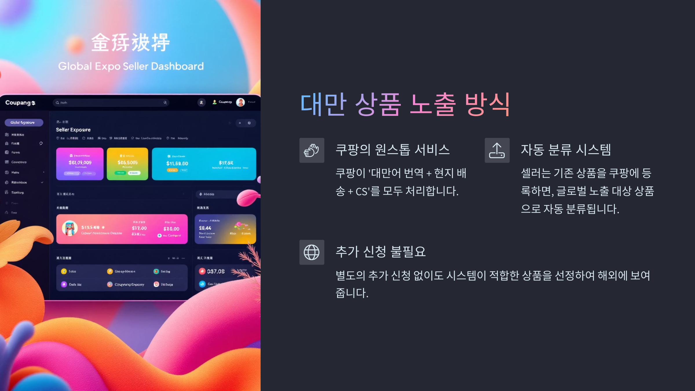 - ✔ 셀러는 기존 상품을 쿠팡에 등록하면, 글로벌 노출 대상 상품으로 자동 분류
