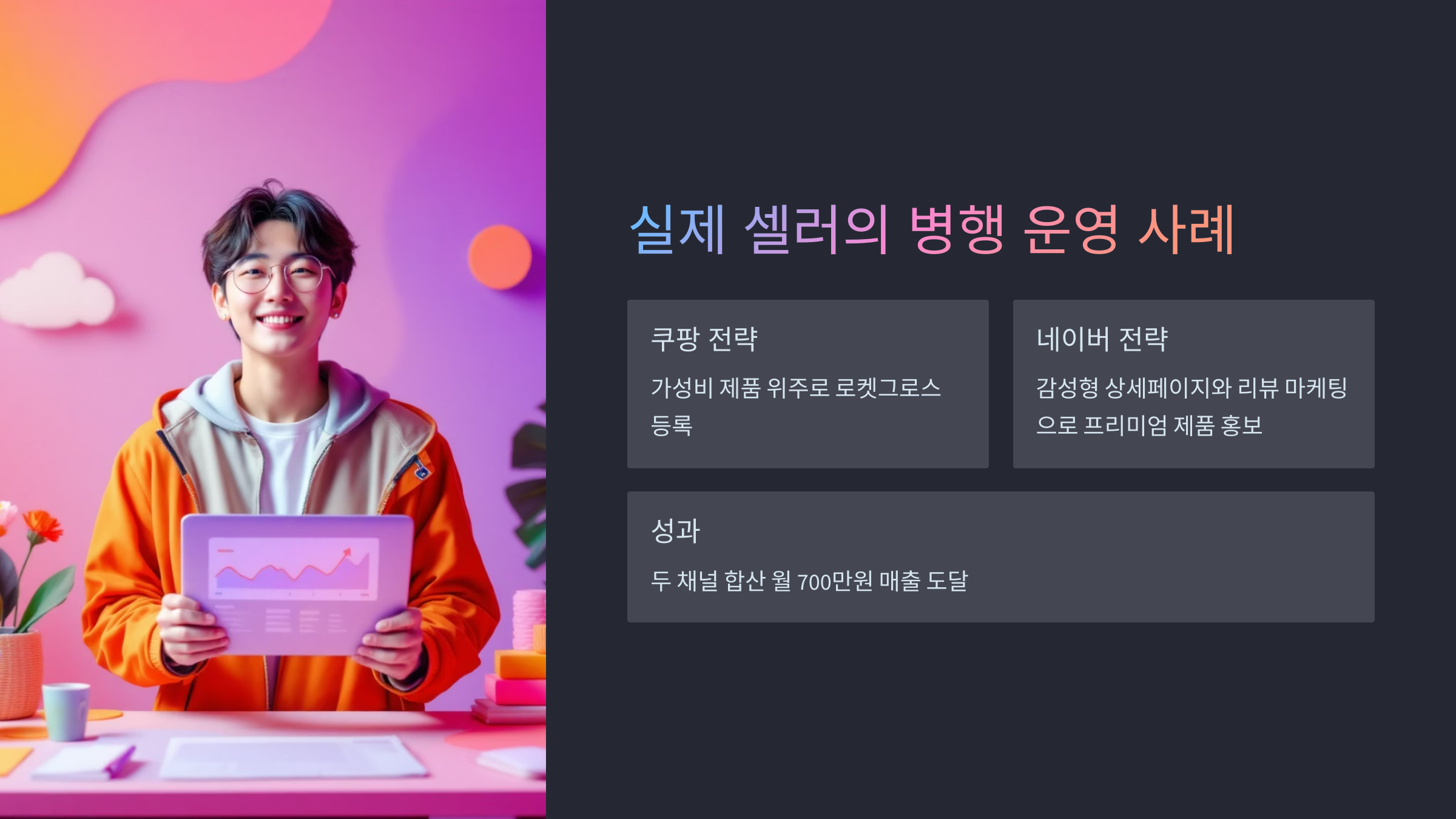“쿠팡은 가성비 제품 위주로 로켓그로스 등록하고, 네이버는 감성형 상세페이지와 리뷰 마케팅으로 프리미엄 제품 홍보” → 두 채널 합산 월 700만원 매출 도달