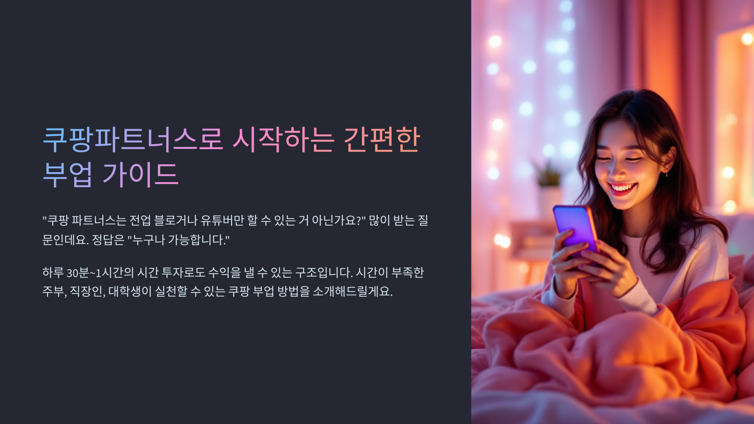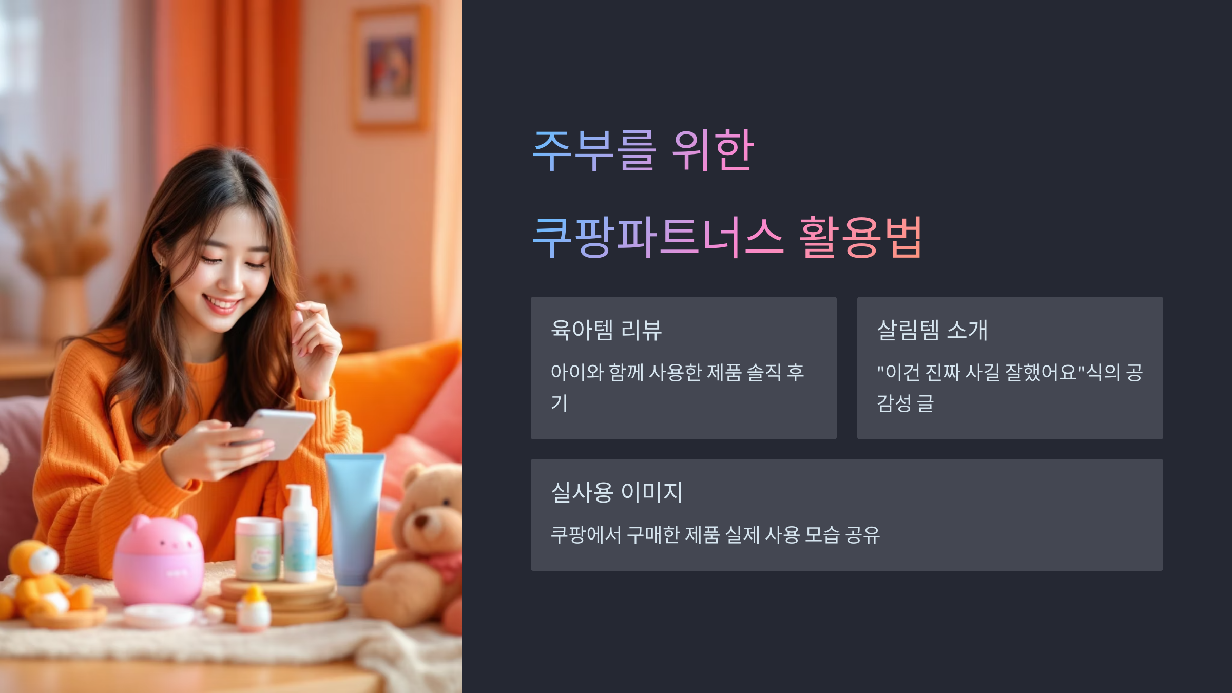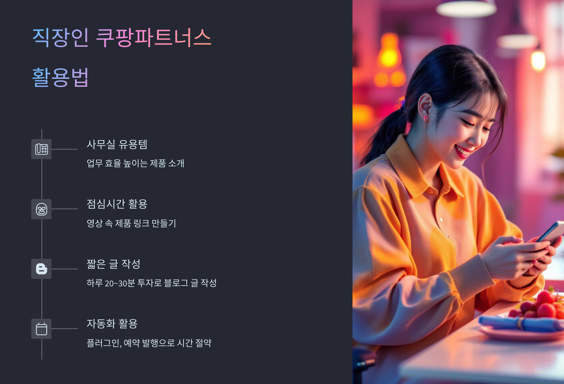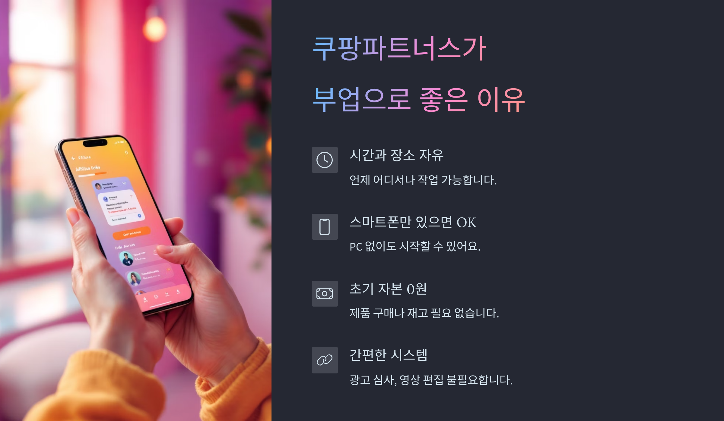하루 30분~1시간의 시간 투자로도 수익을 낼 수 있는 구조. 오늘은 시간이 부족한 주부, 직장인, 대학생이 실천할 수 있는 쿠팡 부업 방법을 소개해드릴게요.