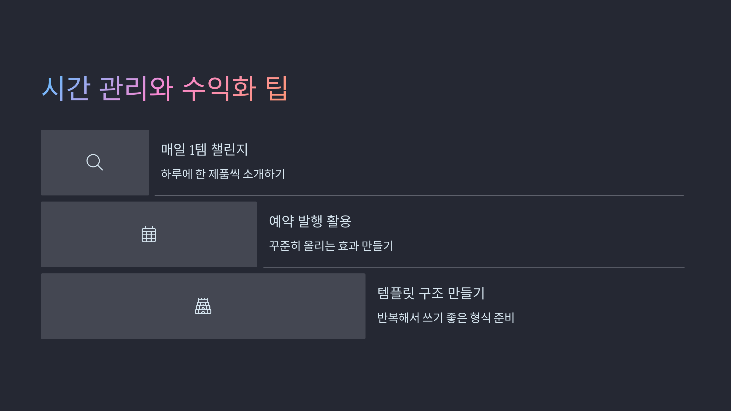 - *사무실에서 유용한 제품*, *점심시간에 보는 영상 속 제품* 등 - 하루 20~30분만 투자해서 블로그에 짧은 글 + 추천 제품 링크만 넣어도 OK - 자동화 플러그인, 예약 발행 활용 추천