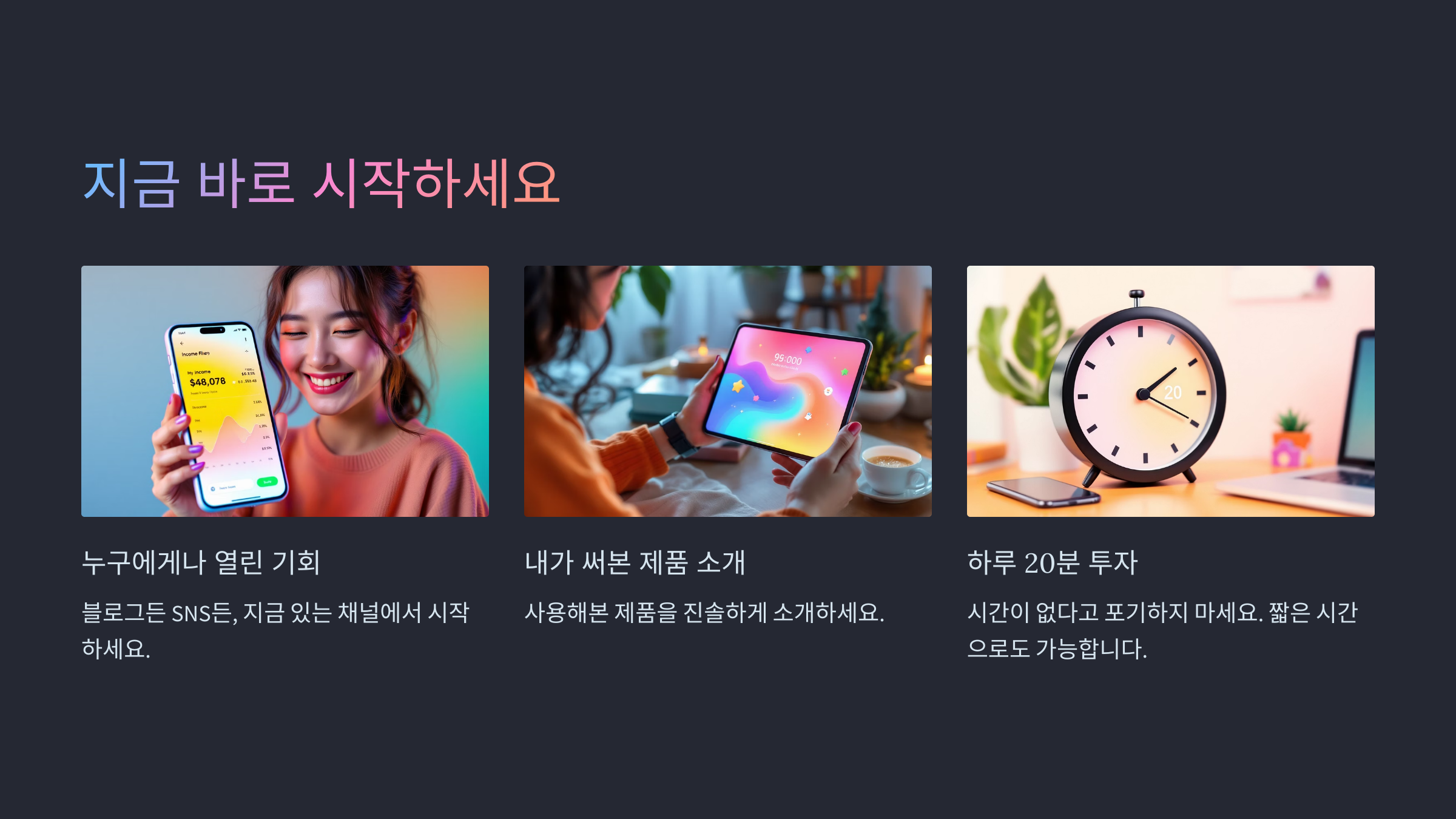 쿠팡 파트너스는 누구에게나 열려 있는 기회입니다. 블로그든 SNS든, 지금 있는 채널에서 내가 써본 제품을 소개하는 것만으로도 내 통장에 수익이 쌓일 수 있습니다. 시간이 없다고 포기하지 마세요. 하루 20분만 투자해도 가능한 부업, 지금 시작해보세요.
