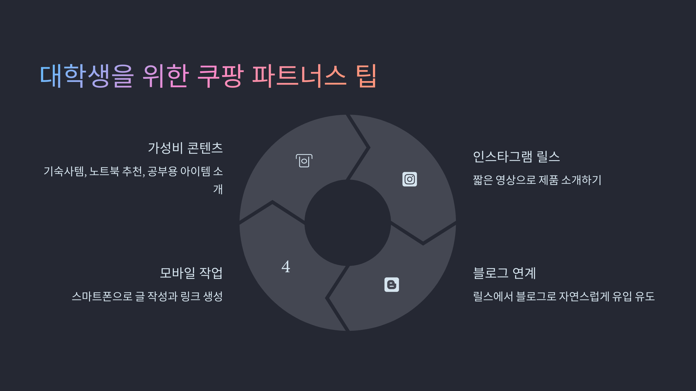 - “가성비” 중심 콘텐츠 (기숙사템, 노트북 추천, 공부용 아이템 등) - 인스타그램 릴스 + 블로그를 연계해 자연스럽게 확장 - *모바일로 글 작성 + 링크 생성 가능*하기 때문에 부담 없이 시작 가능
