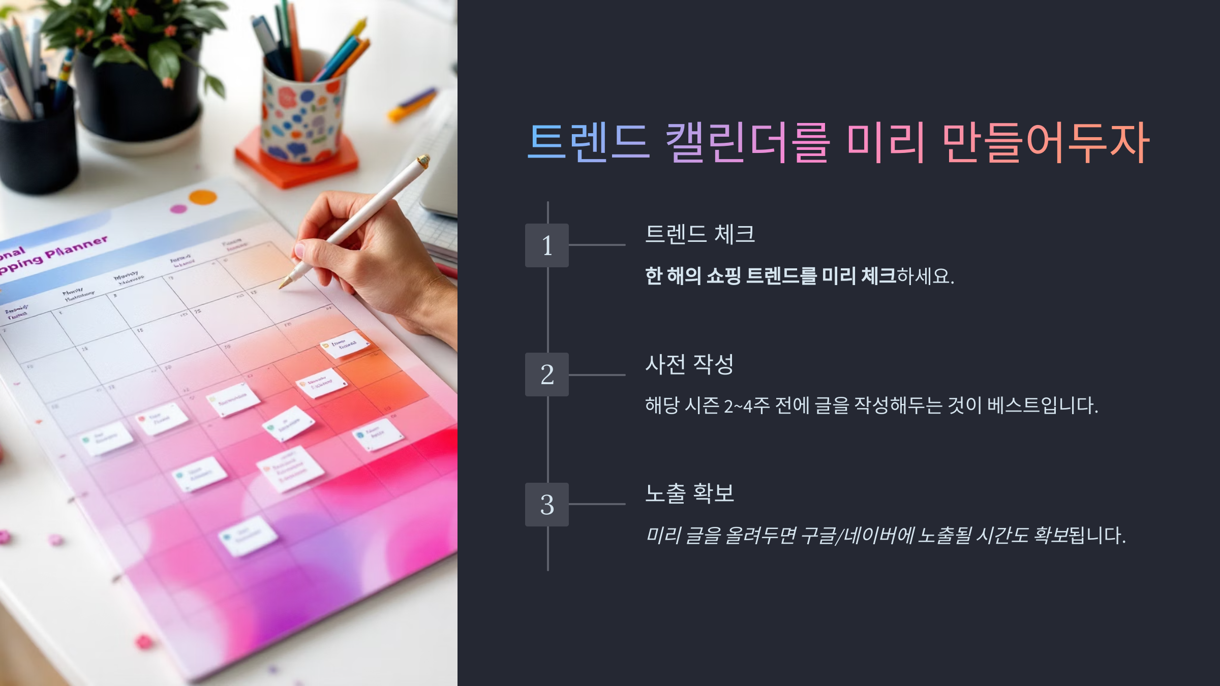 지금 바로 다가오는 시즌 아이템을 정리해서 내 블로그 수익의 새로운 피크를 만들어보세요.