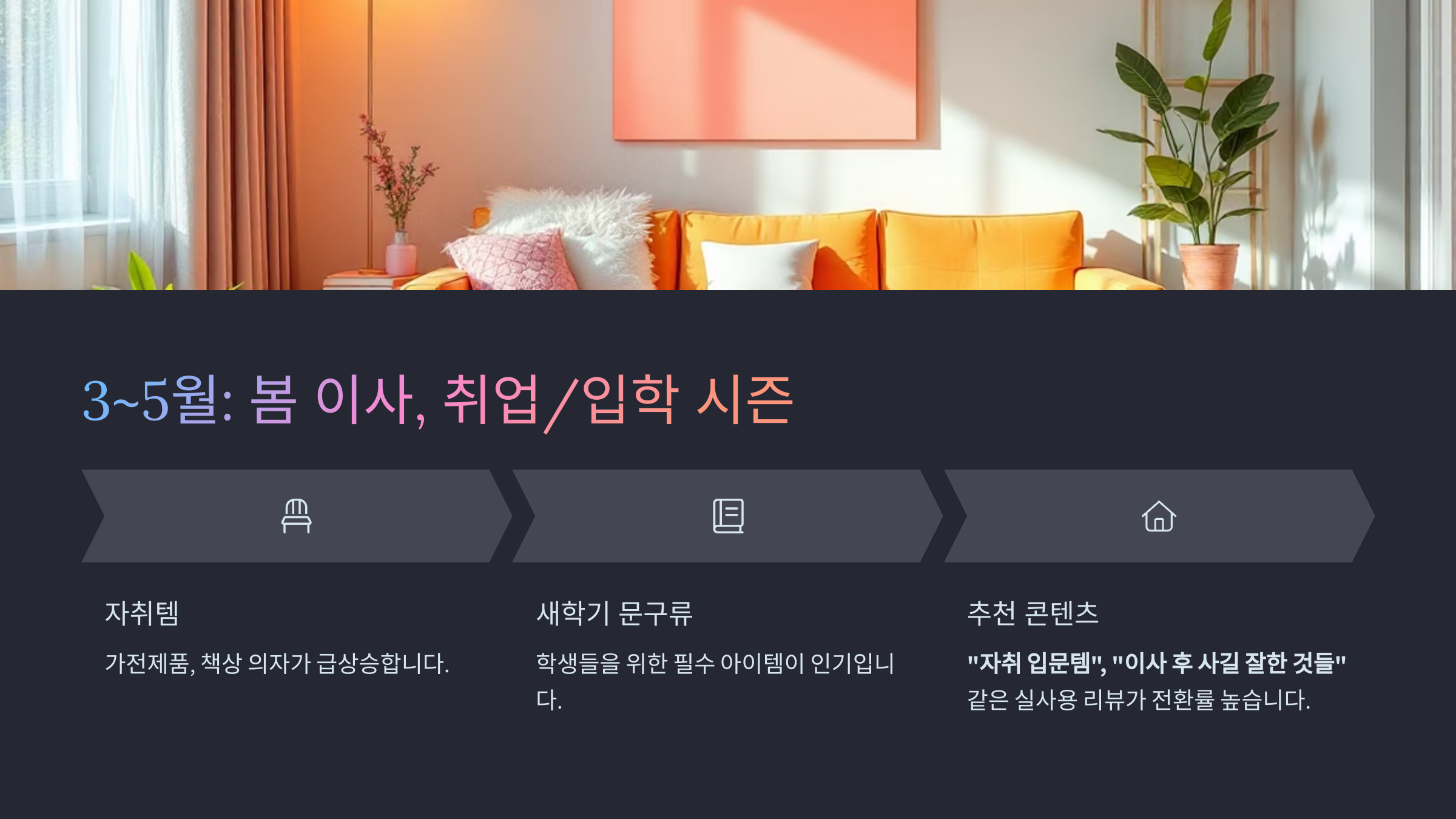- 자취템, 가전제품, 책상 의자, 새학기 문구류 급상승 - “자취 입문템”, “이사 후 사길 잘한 것들” 같은 실사용 리뷰가 전환률 높음