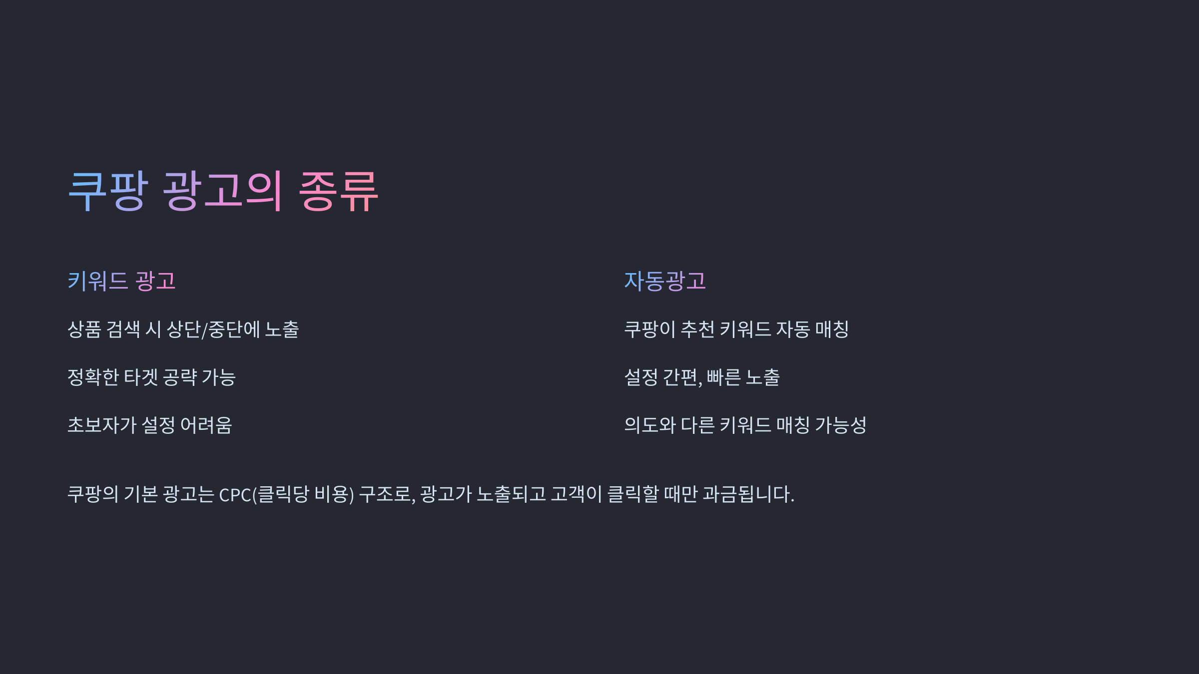 쿠팡의 기본 광고는 CPC(클릭당 비용) 구조로, 광고가 노출되고 고객이 클릭할 때만 과금됩니다.