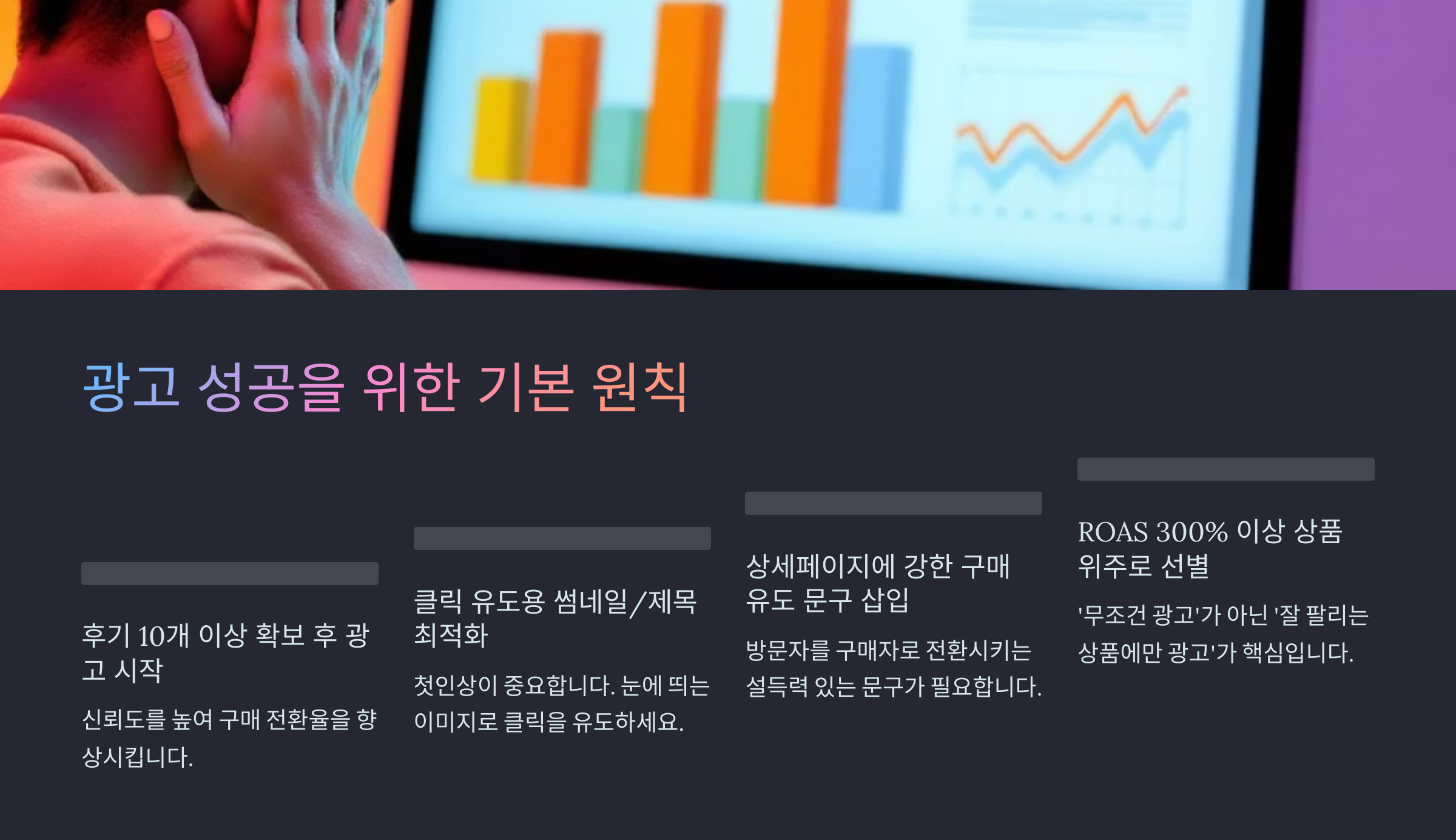 광고는 잘 쓰면 무기지만, 잘못 쓰면 비용만 날릴 수 있습니다. 데이터를 보고 반응이 좋은 상품만 골라 집중하세요.