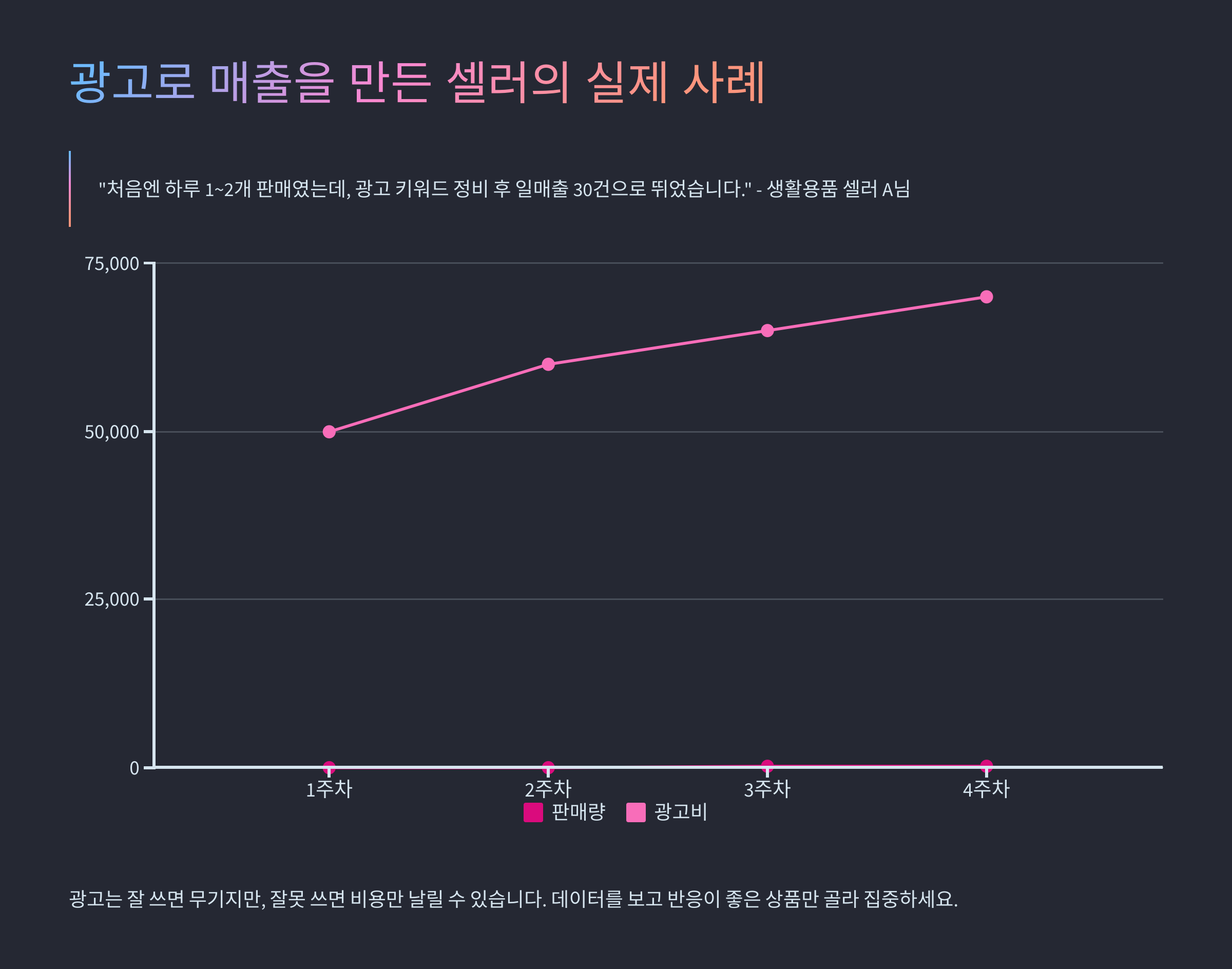 “처음엔 하루 1~2개 판매였는데, 광고 키워드 정비 후 일매출 30건으로 뛰었습니다.” - 생활용품 셀러 A님