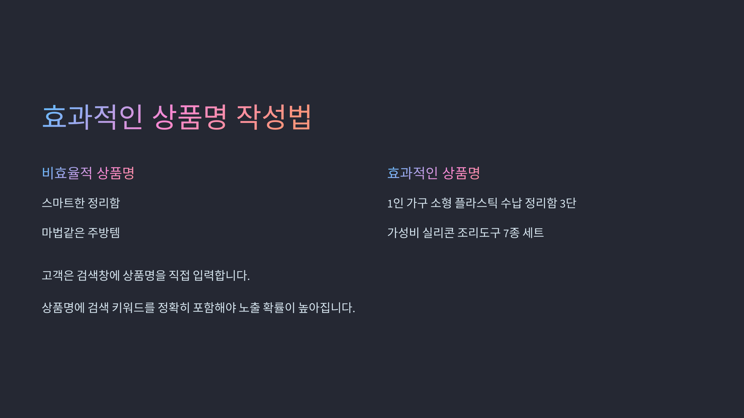 고객은 검색창에 상품명을 직접 입력합니다. 그렇기에 상품명에 검색 키워드를 정확히 포함해야 노출 확률이 높아집니다.