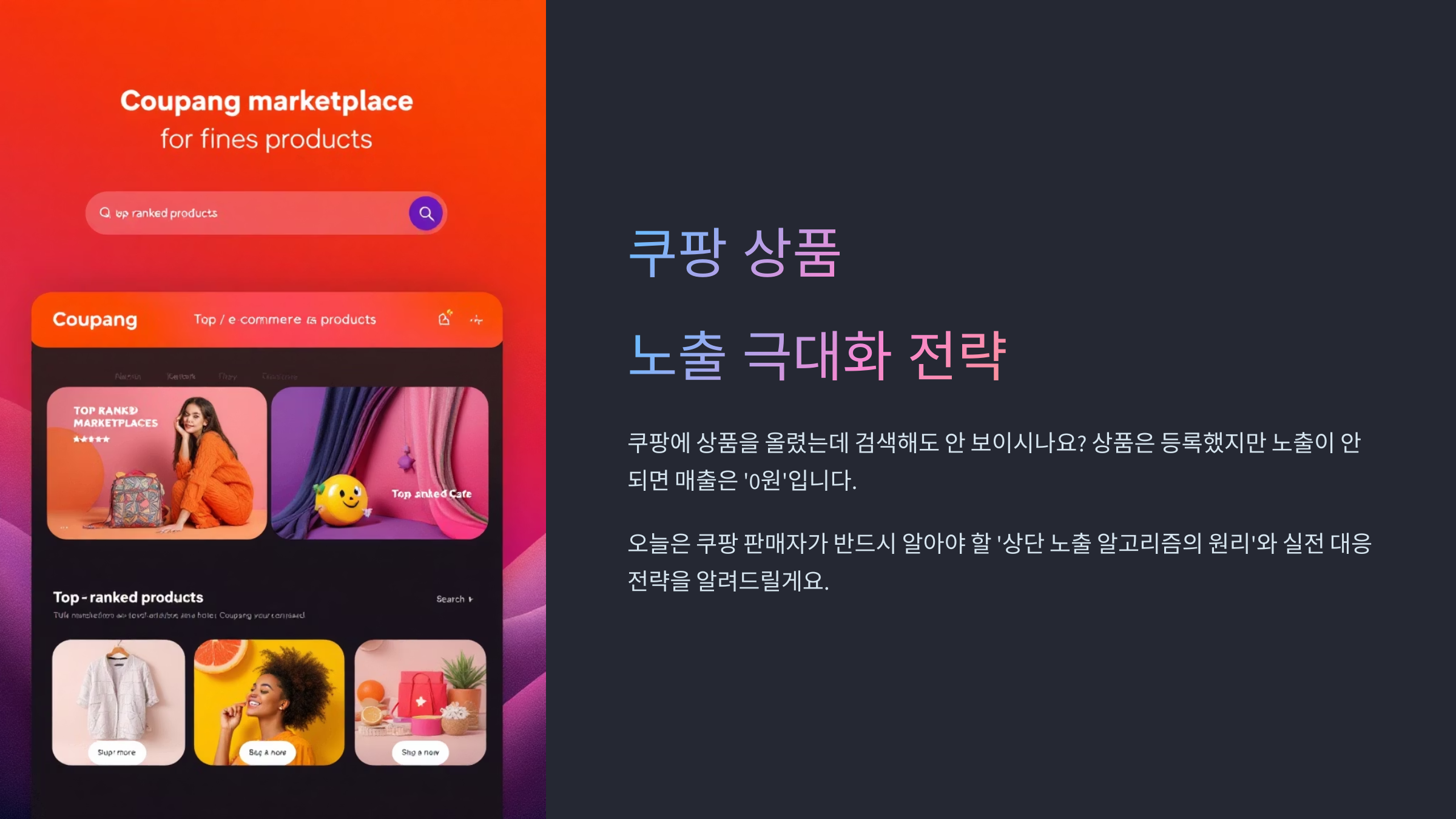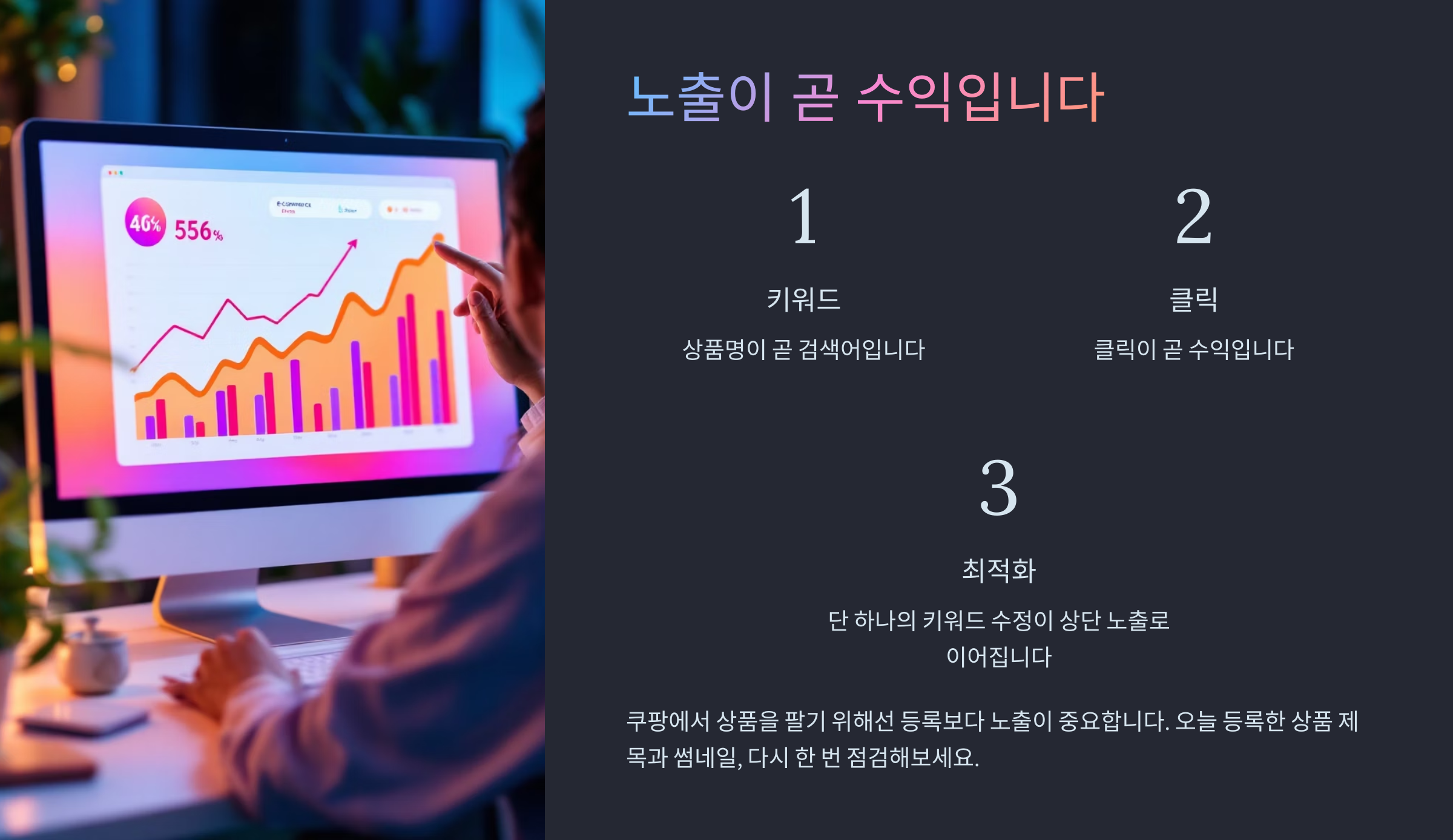쿠팡에서 상품을 팔기 위해선 등록보다 노출이 중요합니다. 상품명이 곧 검색어고, 클릭이 곧 수익입니다.