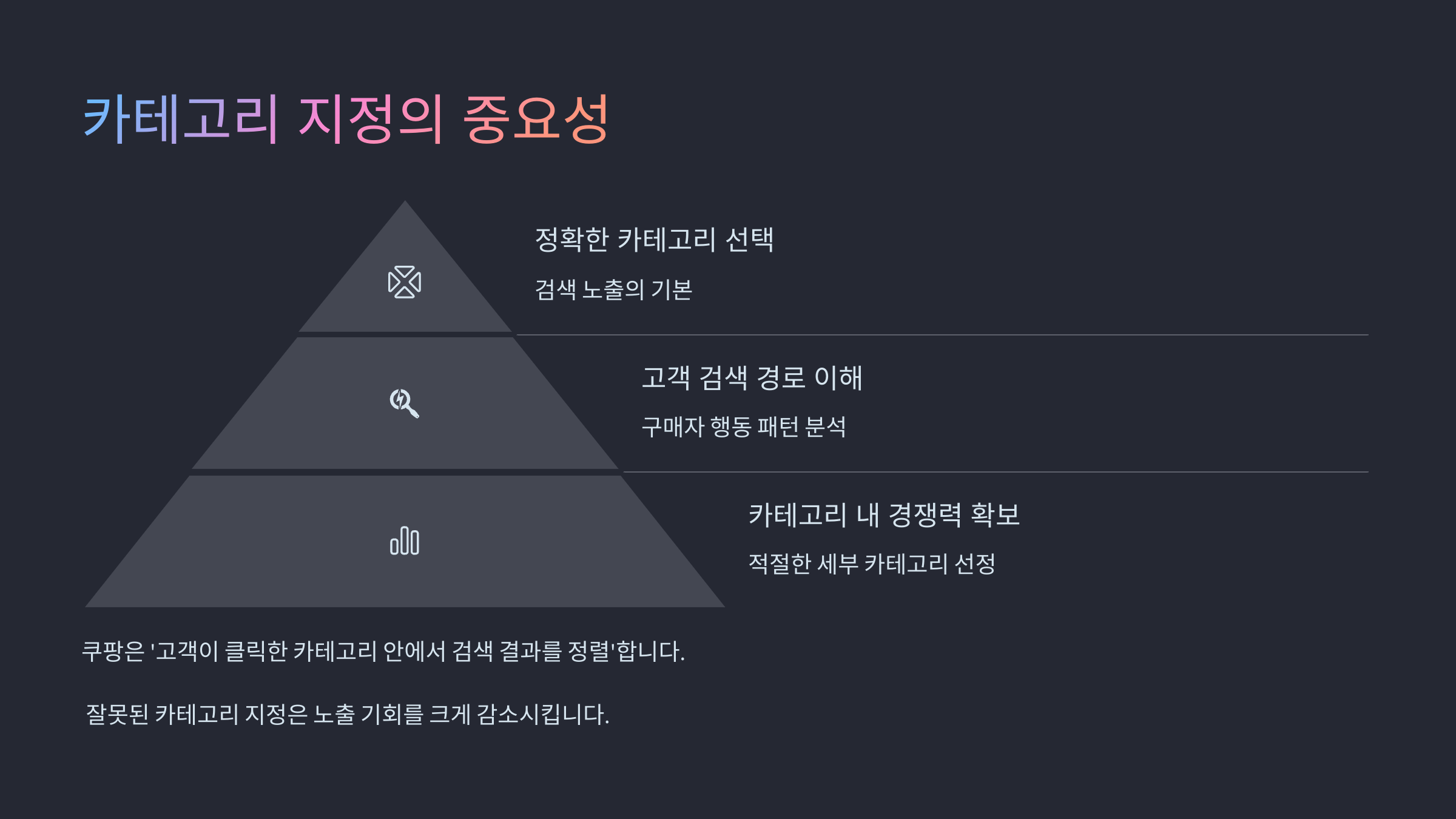 쿠팡은 ‘고객이 클릭한 카테고리 안에서 검색 결과를 정렬’합니다. 예를 들어 ‘주방용품’ 키워드로 들어왔는데, 상품이 ‘생활잡화’로 분류되어 있으면 검색 상단에 노출될 확률이 크게 줄어듭니다.