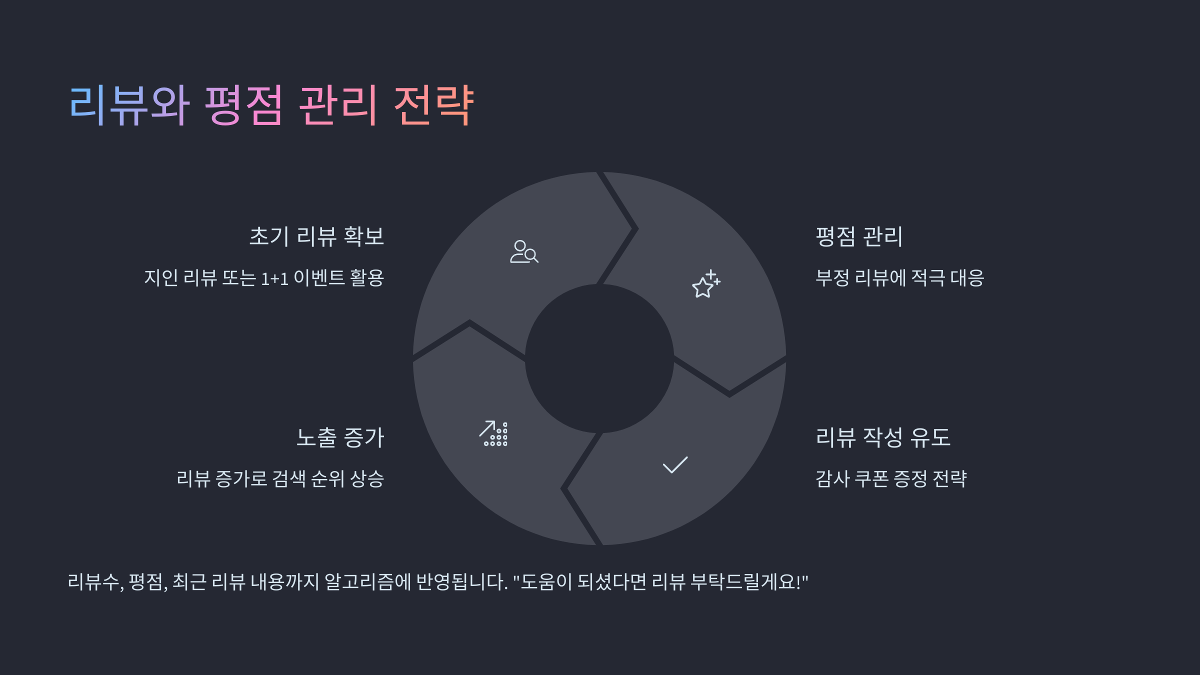 ✔ 리뷰수 + 평점 + 최근 리뷰 내용까지 반영됩니다. 초반 판매 시에는 지인 리뷰 or 1+1 이벤트로 리뷰 확보가 중요합니다.