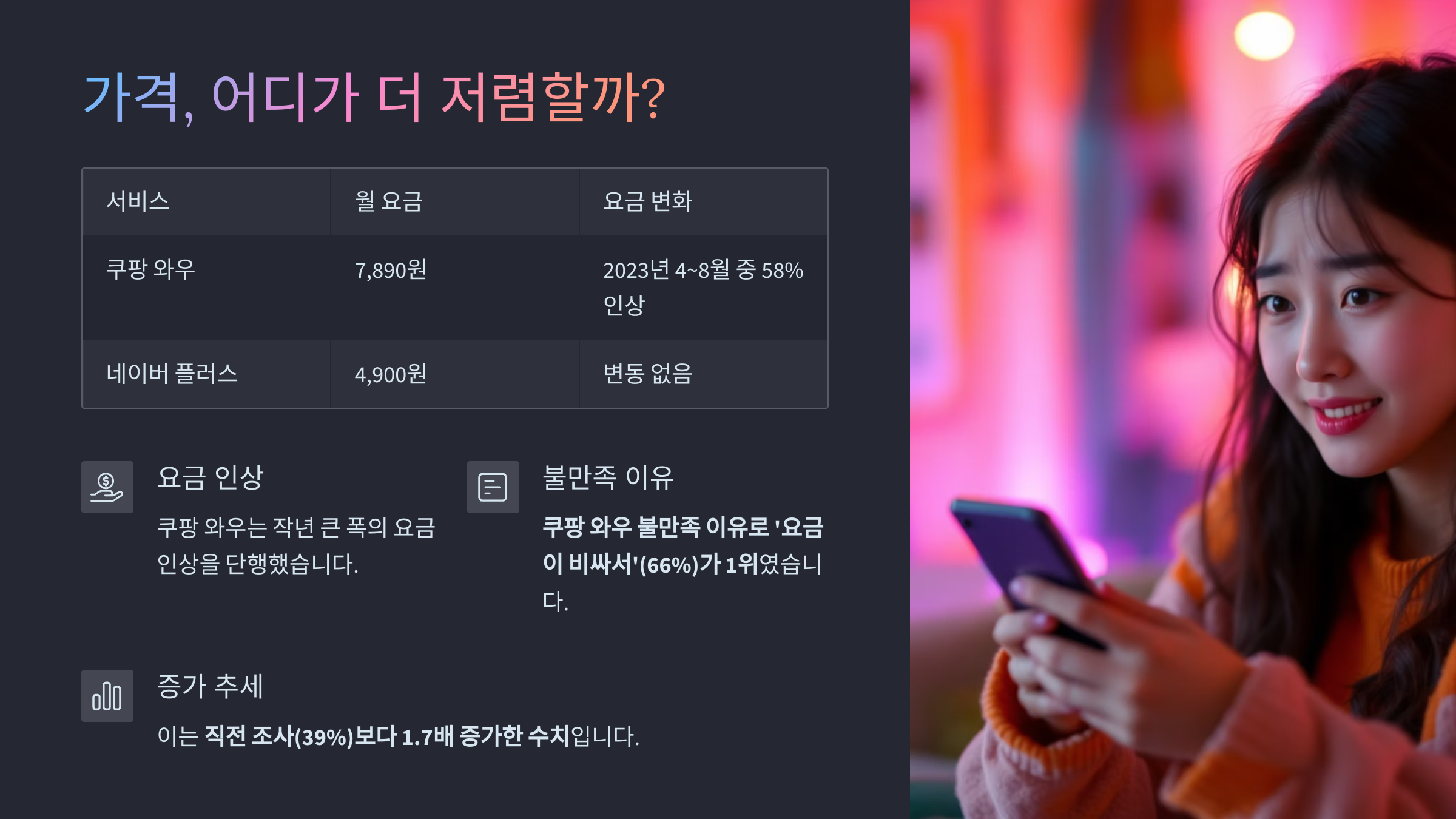 실제 조사에서도 쿠팡 와우 불만족 이유로 ‘요금이 비싸서’(66%)가 1위였고, 이는 직전 조사(39%)보다 1.7배 증가한 수치였습니다.