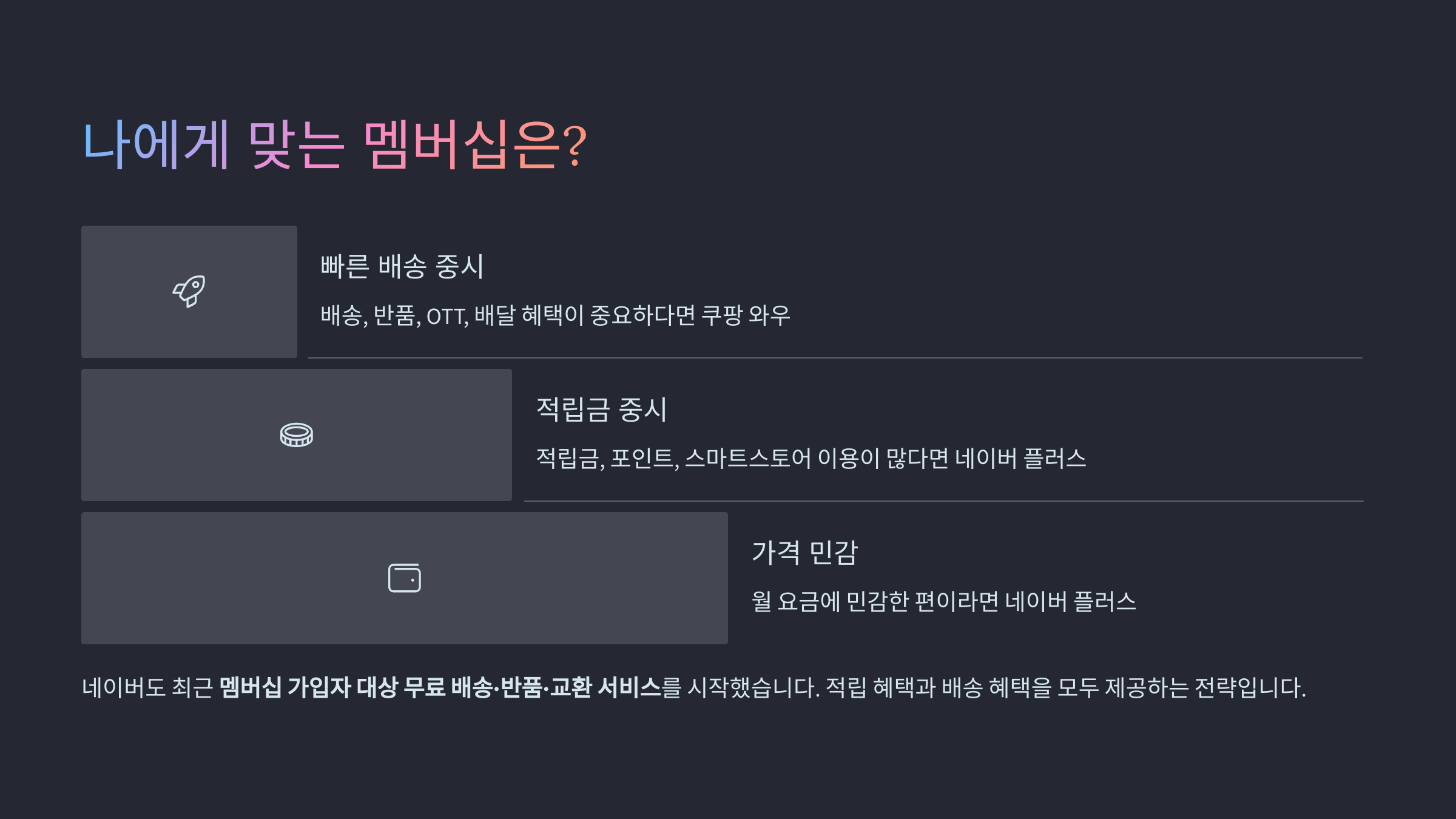 이제 멤버십은 단순한 배송 할인 서비스를 넘어 쇼핑 경험 전체를 좌우하는 중요한 요소가 되었습니다.