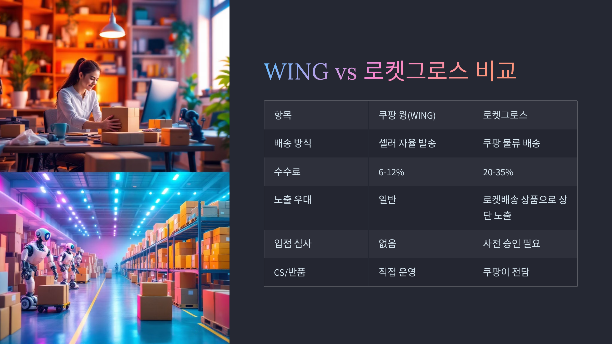 | 항목 | 쿠팡 윙(WING) | 로켓그로스 |