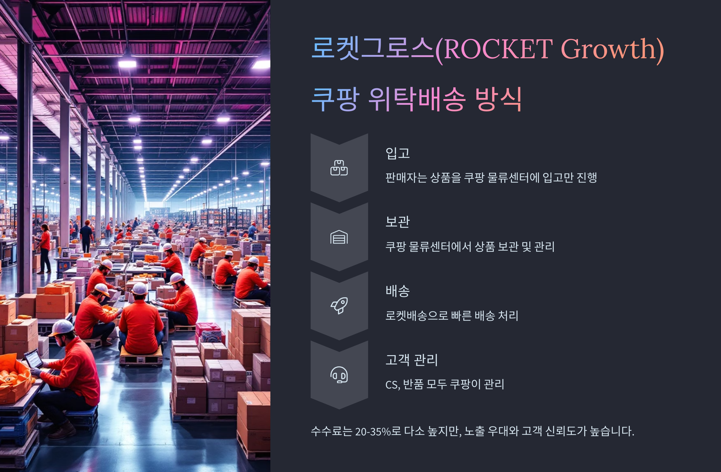 판매자는 상품을 입고만 하면, 배송·CS·반품 모두 쿠팡이 관리합니다.