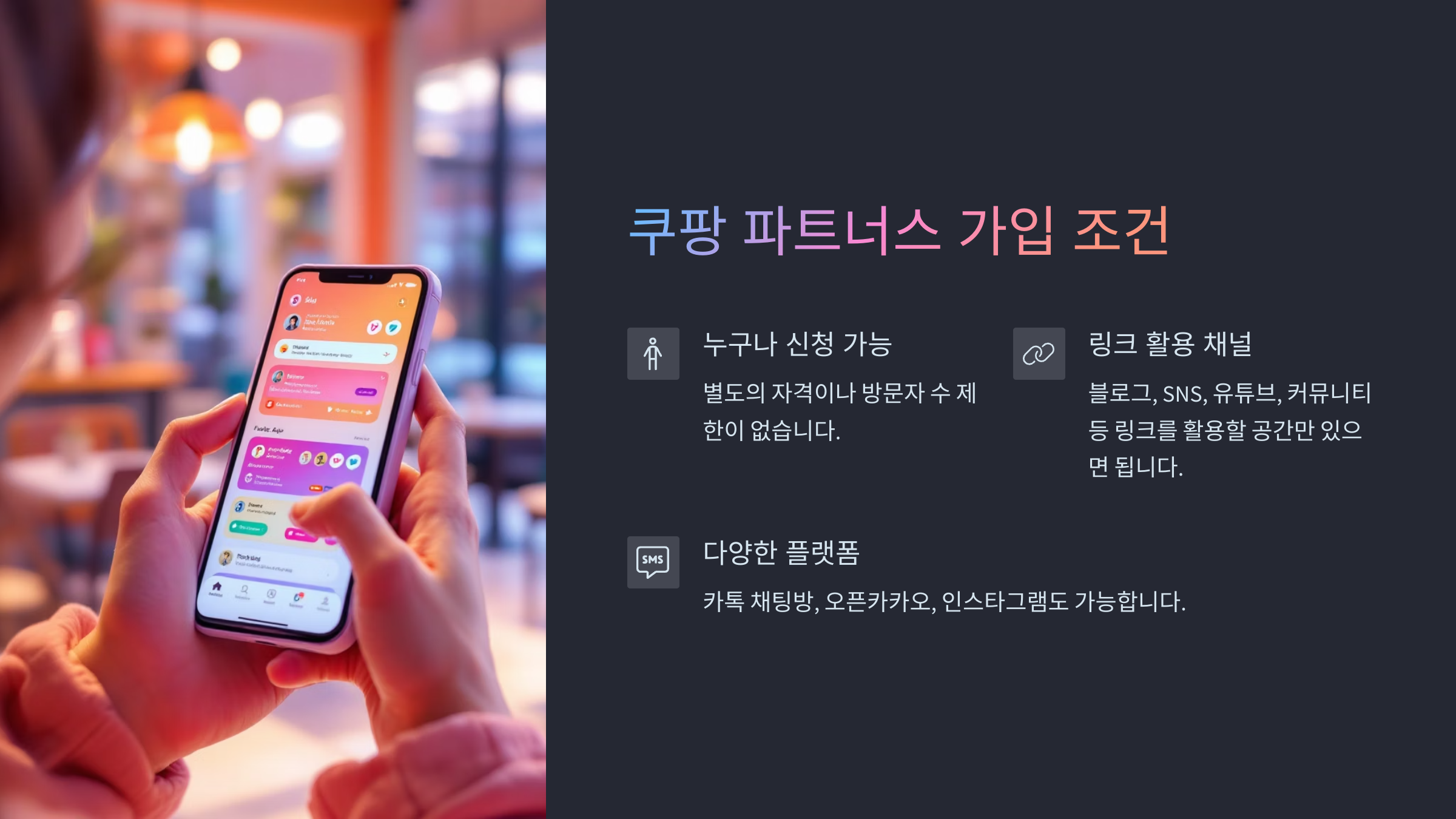 쿠팡 파트너스는 누구나 신청 가능합니다. 별도의 자격이나 블로그 방문자 수 제한도 없으며, SNS 또는 유튜브, 블로그, 커뮤니티 등 링크를 활용할 채널만 있다면 누구든지 참여할 수 있습니다. 심지어 처음부터 블로그가 없어도, 쿠팡 링크를 활용할 공간(예: 카톡 채팅방, 오픈카카오, 인스타그램 등)만 있으면 신청이 가능합니다.