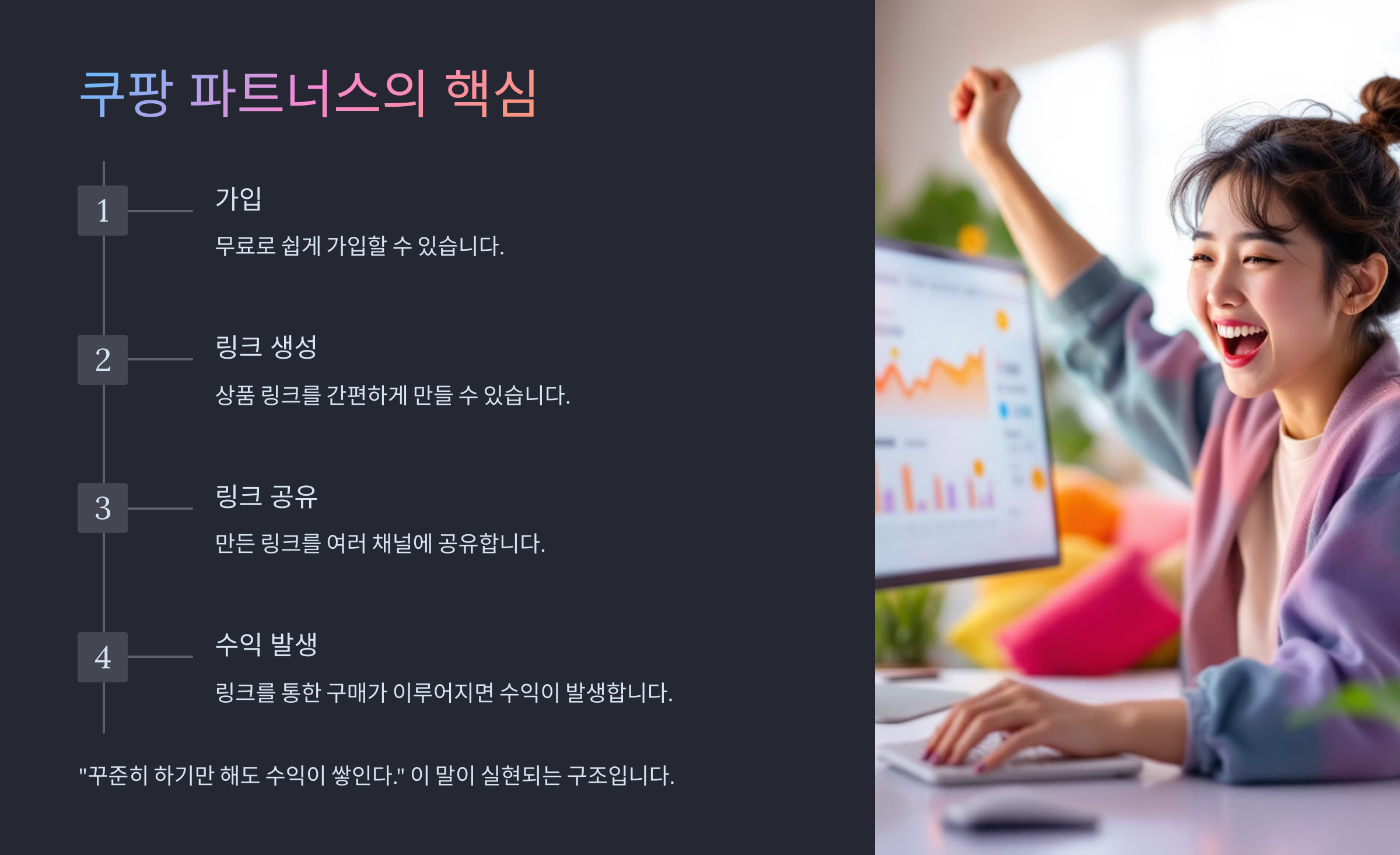 가입만 해도 링크를 만들 수 있고, 링크를 뿌리기만 해도 수익이 발생하는 구조. 이게 바로 쿠팡 파트너스의 핵심입니다.
