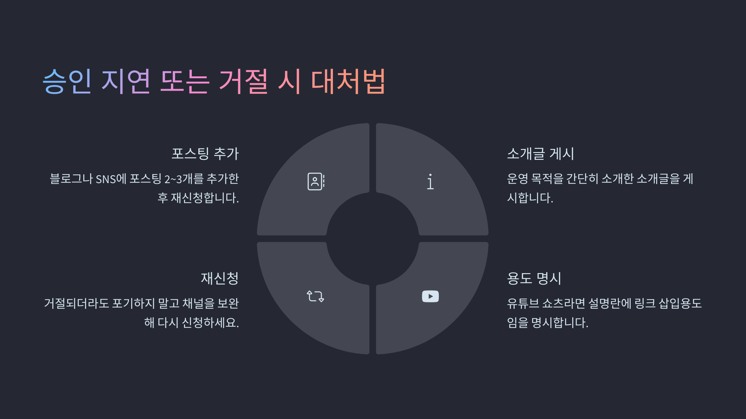 한 번 거절됐더라도 포기하지 마세요! 채널을 조금만 보완해서 다시 신청하면 대부분은 승인됩니다.